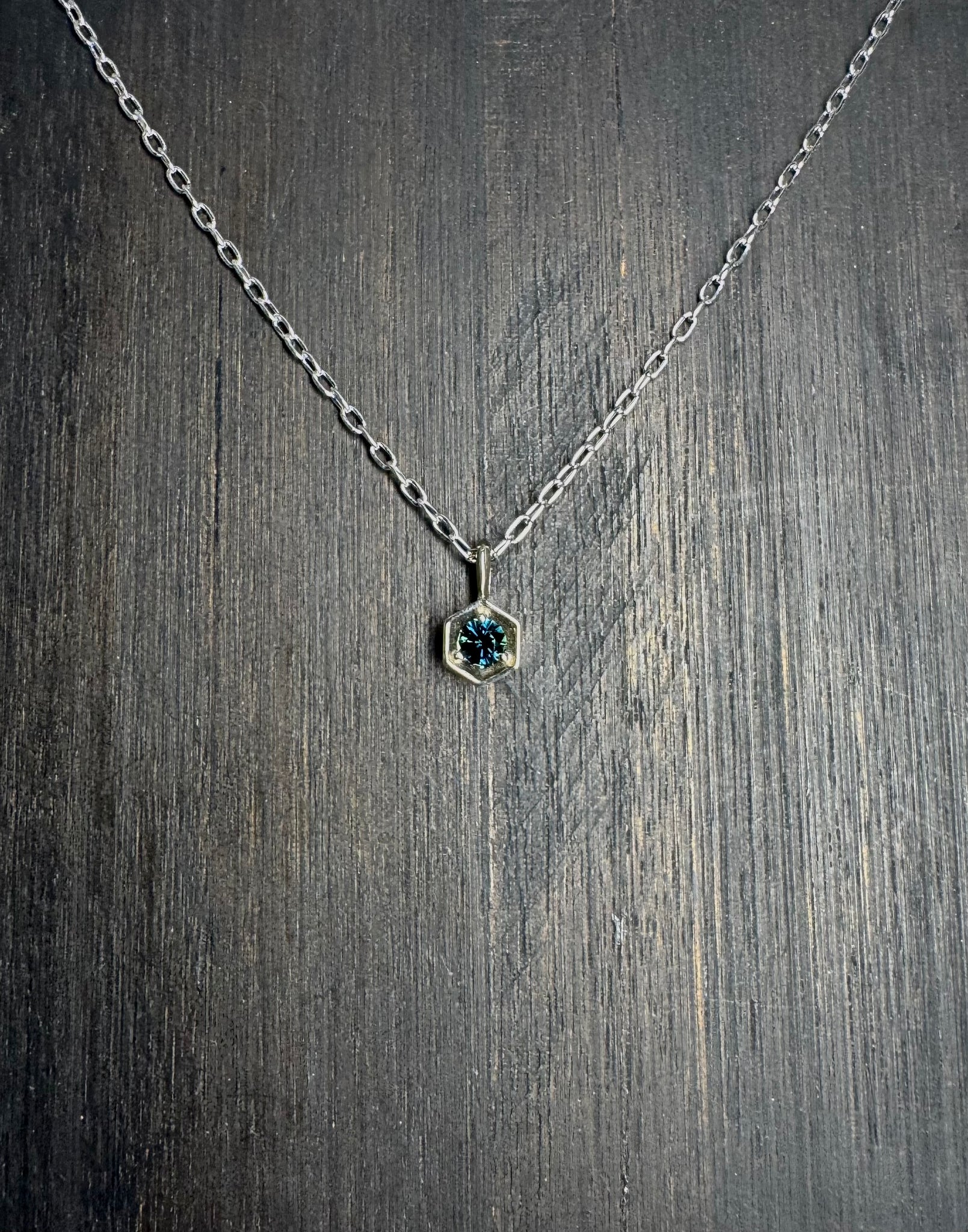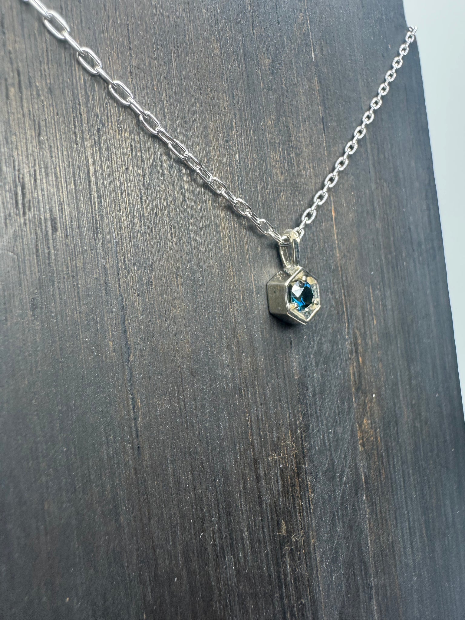 Parti Sapphire set in 14K white gold Hex with an open link 14K white gold 18" chian